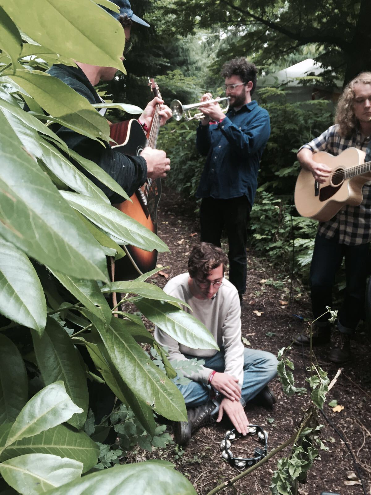 The band members were standing around singer-percussionist Julian, who sat sitting cross-legged on the earth, and together played a soft acoustic version of "No Woman", the lead track from their lauded self-titled debut album, under branches and deep green leaves of the forest.
