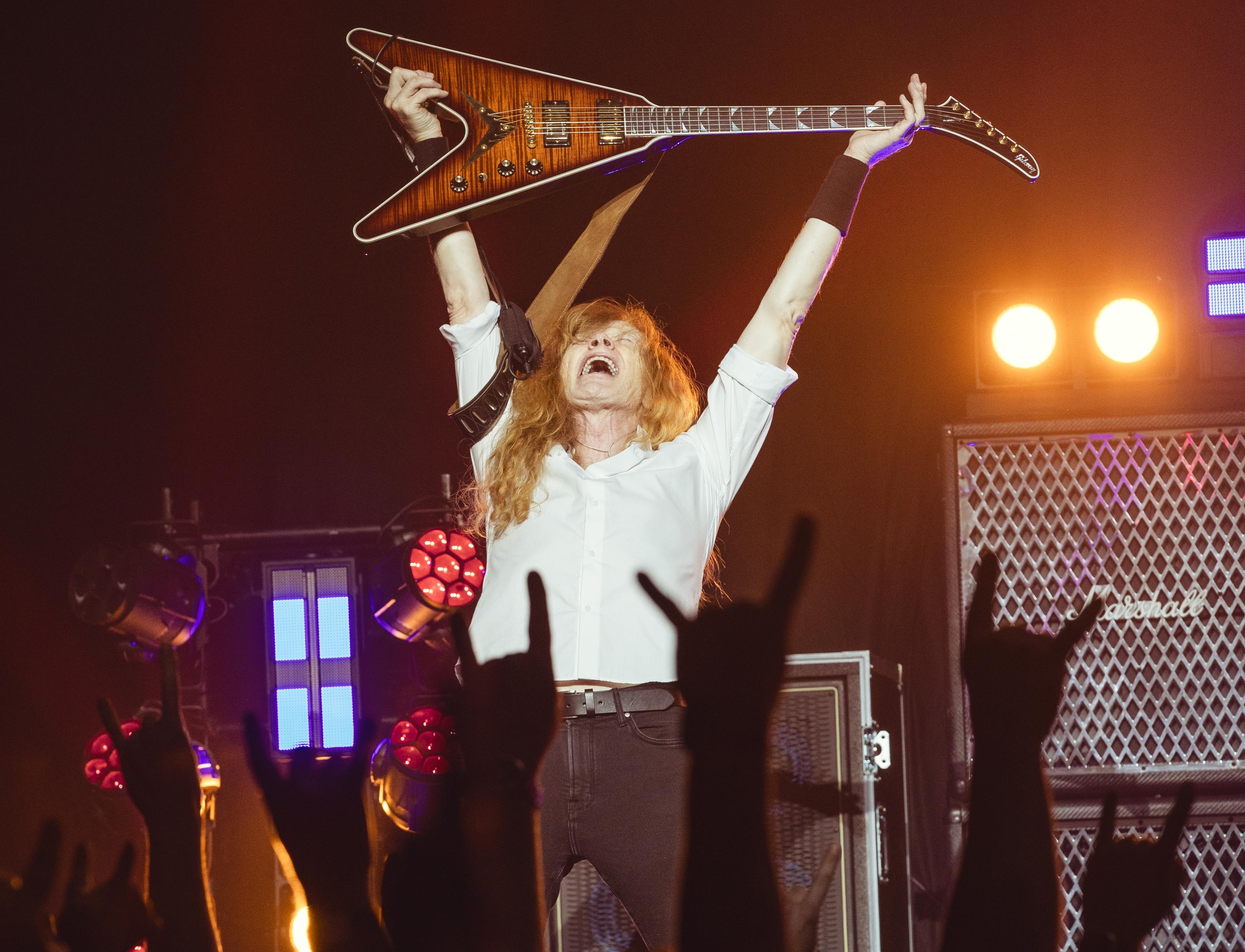 Without fanfare, dry ice or pyrotechnics, Megadeth stroll on to the tight chugs of “Skin o’ my Teeth” from Countdown to Extinction. If you’re here for showbiz, it’s kept to the minimum: a handful of arcing hair sweeps (flaunt it if you’ve got it), Quo-like synchronised guitar pointing, and a brief appearance from the band’s skeletal mascot.