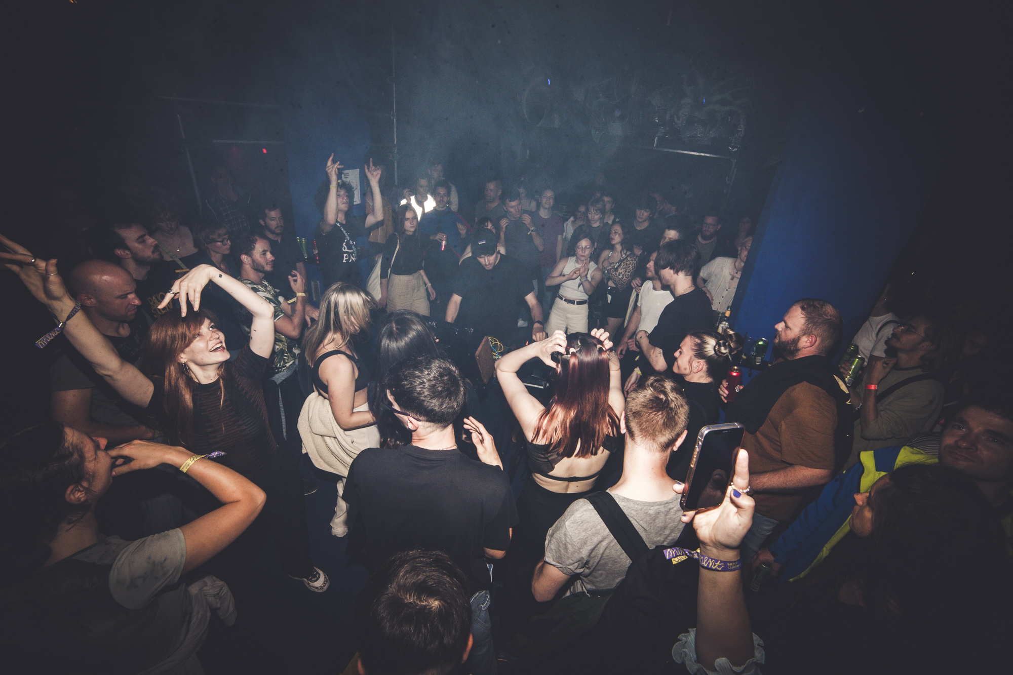 HTRL is positioned in the centre of Channel Zero’s dancefloor; a chaotic jumble of red, blue, green and yellow wires exposed through the darkness, glaring in the flashes of strobe lights. Punters are sat on the scaffolded platform above the venue, but not for long. The Czech’s steady rhythms throb, building in intensity and euphoria, until the venue erupts as the beat drops into almost an instrumental euro-dance climax.