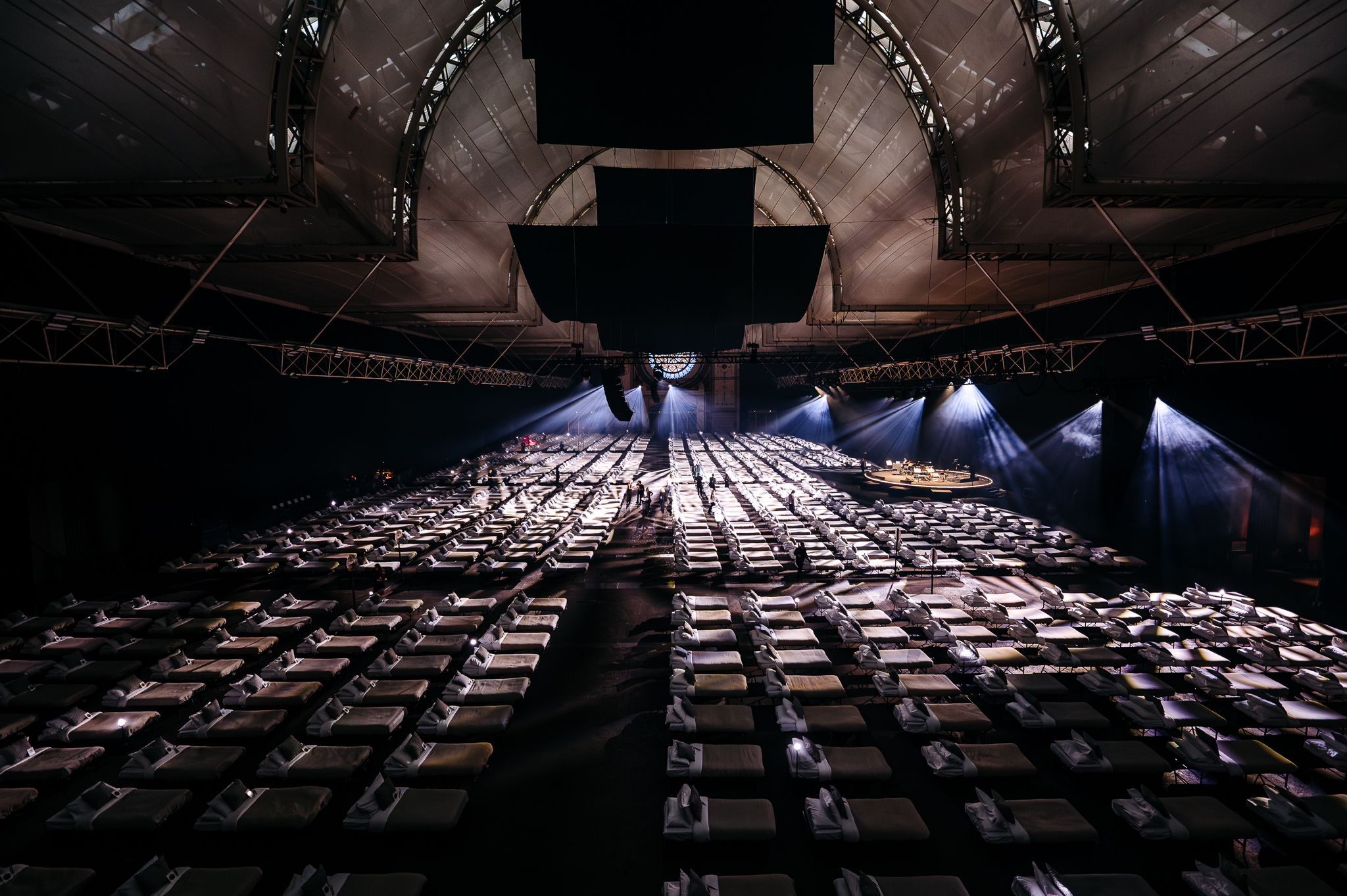 Inside, under the grey haze of dimmed lamps, the atmosphere within the Great Hall is peaceful yet strangely unnerving. There’s a dystopian air to the sight of 700+ beds stretched wall to wall in the dusky gloom. “There are really no rules for the SLEEP performance,” Richter shares in his concise, opening speech. “You can stay awake all night listening, you can sleep, you can do a bit of both as you like. There’s no rules really.” He gives thanks to his partner Yulia Mahr and the musicians poised to begin on the small, circular stage, and with a final “we’ll see you on the other side,” the composer takes his seat at the grand piano, letting the first low, rhythmic note of the 8-hour performance ring out.