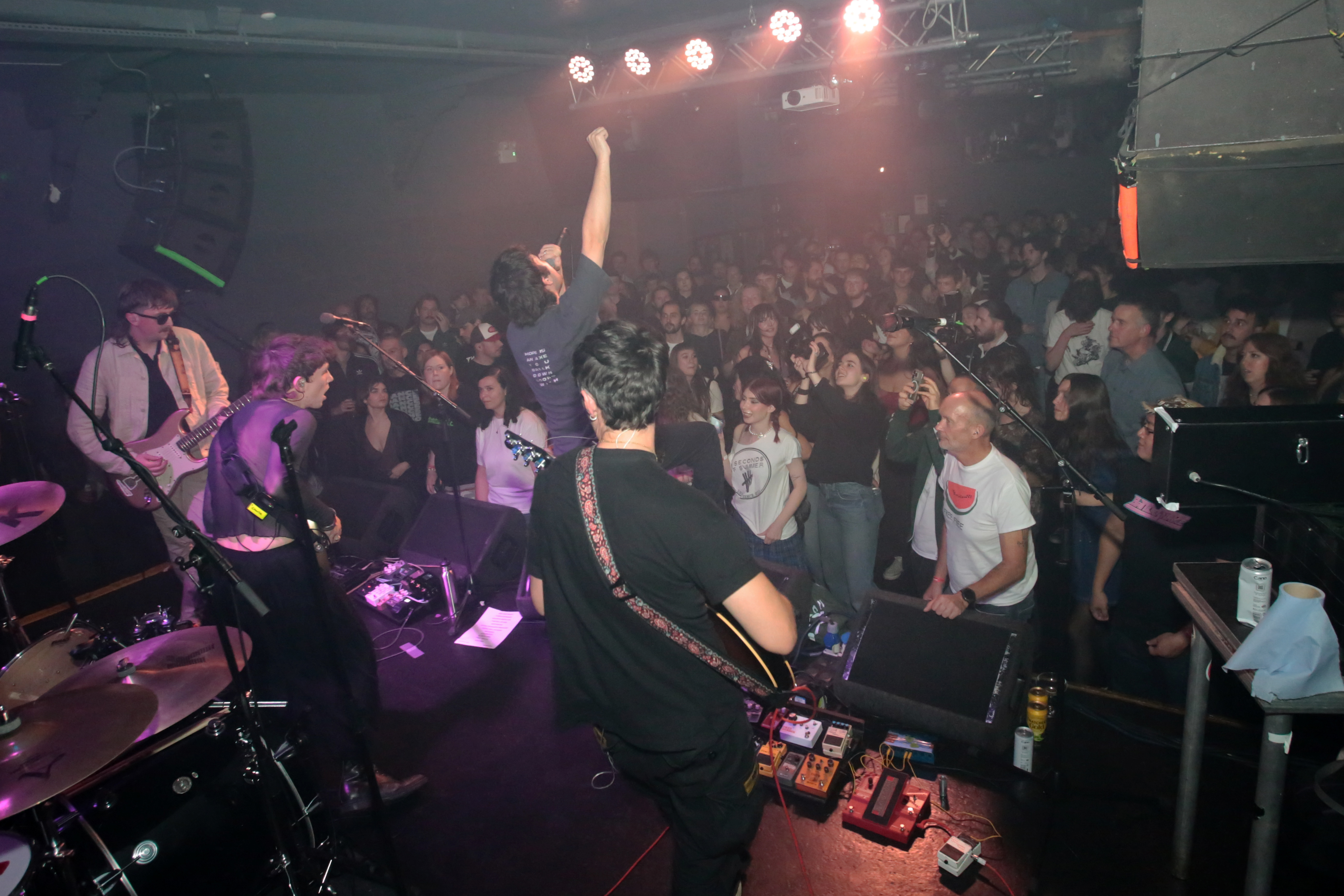 Doused in glowing red lights beneath a disco ball – with a guitar case balanced on a keys stand as a makeshift synth table – the fun-filled DIY nature of Courting’s set felt more like a house party than a straightforward venue show. With a tongue-in-cheek grin, the band’s singer gulped down a bottle of SON Estrella Galicia and turned to the audience: “Sounds like we’re taking a piss, but what a beer!” he beamed, bursting into “The Wedding” and sending fans into an exuberant frenzy.