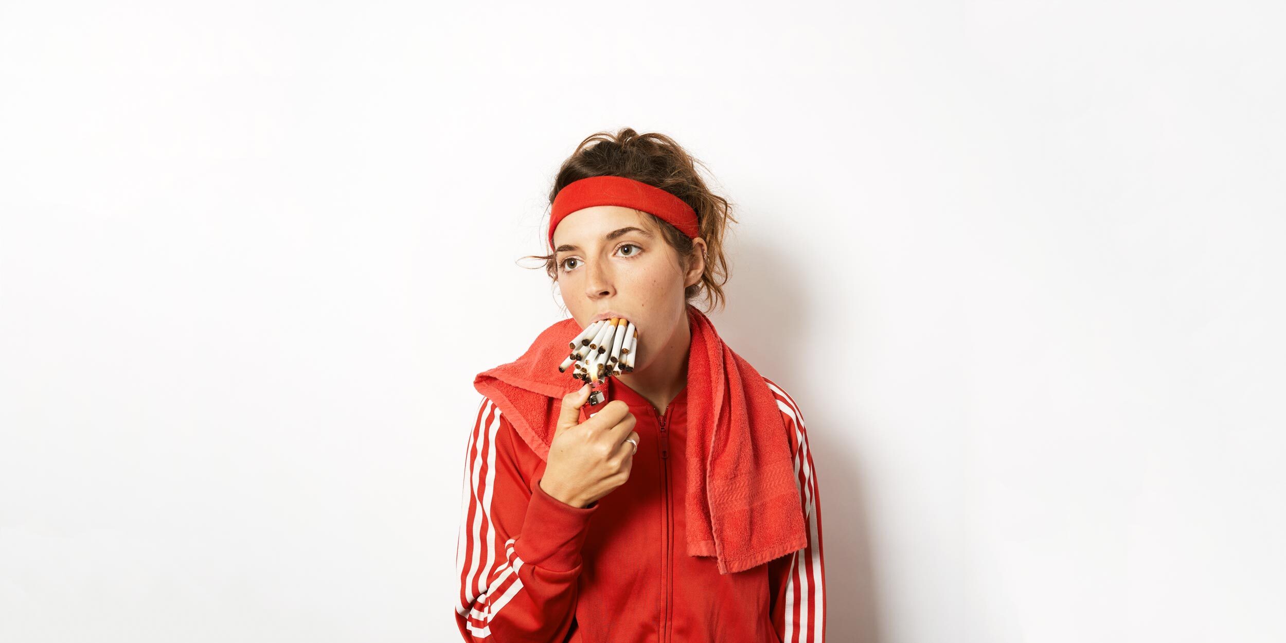 In the same way directors like Lynch and Almodòvar fuse pop elements (Lynch’s use of iconic Americana, old Hollywood, classic crooner soundtracks, Almodòvar’s flaming colors, 60s-style nostalgia, and so on) with the bizarre, I’m attempting to fuse pop elements with serious subject matter in my music, and inject my own personal weirdness into the visuals. Using LONER’s cover art as an example, I’ve pulled from my inspirations by taking an iconic image––in this case an athlete in a tracksuit––and turning that relationship on its head. Because we don’t associate athletes with smoking 30 cigarettes at once the image turns bizarre and comedic very quickly (thanks, David Lynch!).
