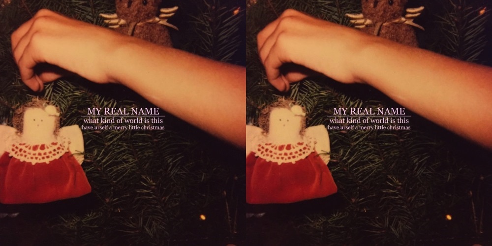 “what kind of world is this” is paired with a sombre reworking of a festive classic, “have urself a merry little christmas". The cover provides a fitting complement to the original track. Jacobs explains that while his mother “didn't love the holidays, if I remember correctly, [...] she liked it when I'd sing Christmas songs.” Jacobs uses the original version of the lyrics (written by Hugh Martin for July Garland in the film Meet Me In St Louis), that were deemed too dark and eventually rewritten. Adding a personal touch to the proceedings, MY REAL NAME's version also features the following line, “I've never liked the holidays / I might just drink them away / Now both of my loves are gone / I've got nothing left to say”, presumably written by Jacobs to reflect both the loss of his mother and end of his marriage as he explains in the liner notes.