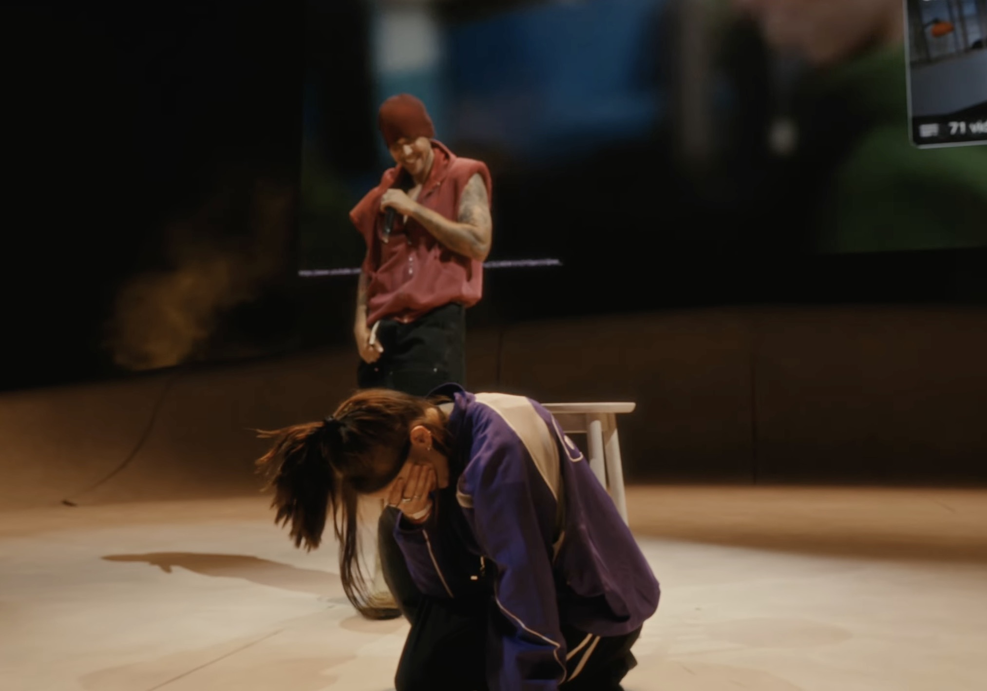 During his first performance of “One Less Lonely Girl” since 2020 – a 2009 track which originally became known for ritual where Bieber would bring a female fan onstage – his wife Hailey Bieber pushed a visibly unsuspecting Billie Eilish into the spotlight, after which Eilish promptly burst into tears.