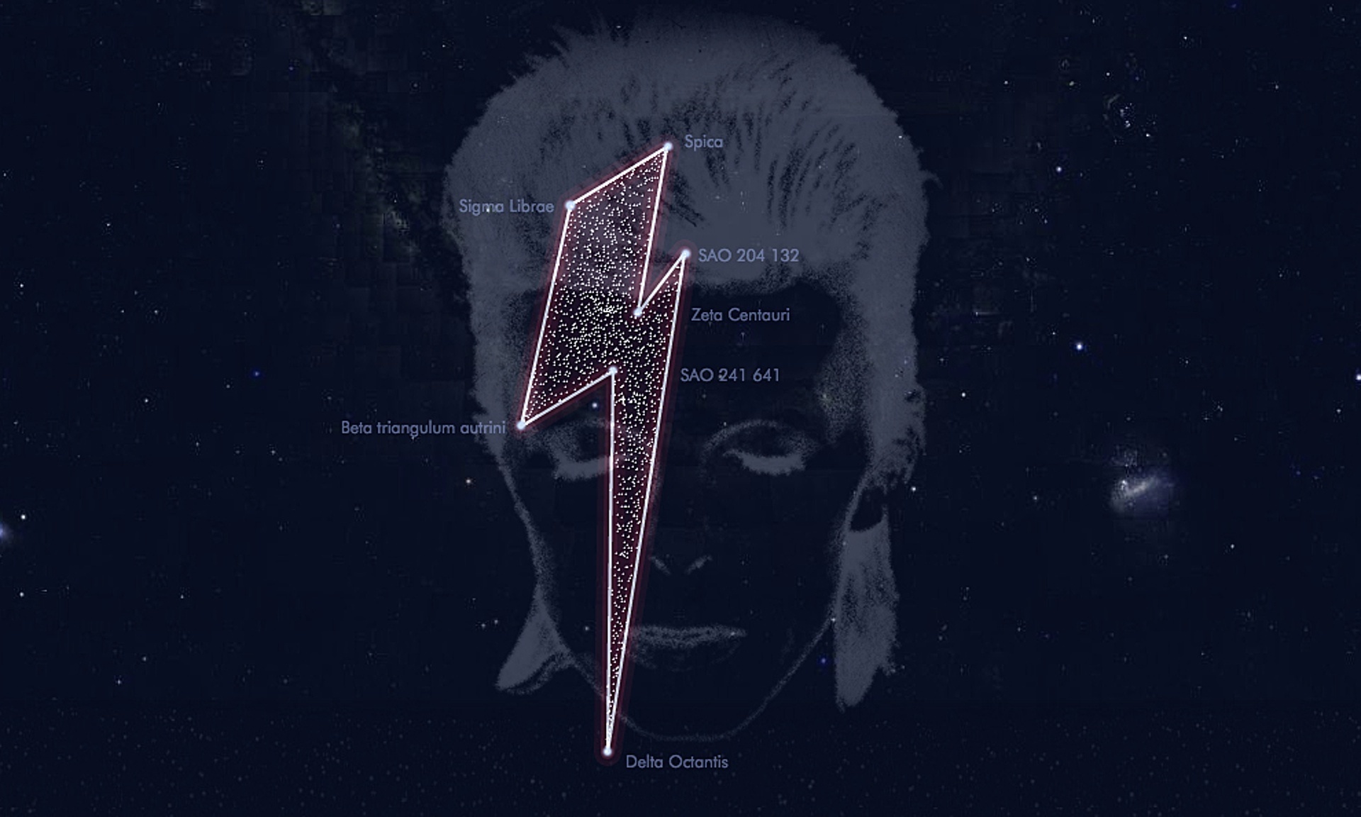 The constellation depicts Bowie's iconic lightning bolt-shaped facepaint from the Aladdin Sane cover, and consists of seven stars.