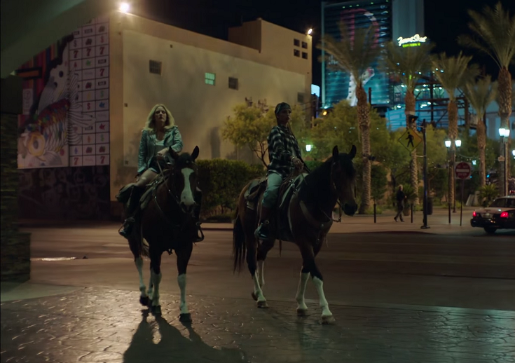 Ellie Goulding trots down the Las Vegas strip on a horse in her "On My Mind" vid