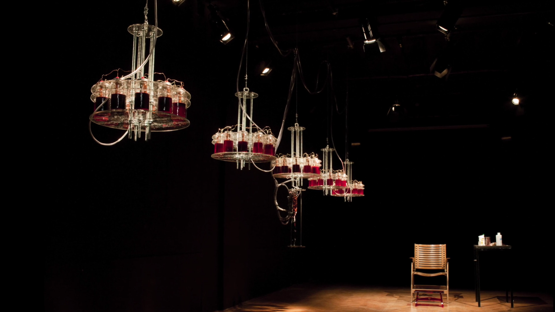 An electronic component makes noise using energy provided by the blood's metallic ingredients, and is apparently - so says the artist - inspired by the writings of Alexander Bognadov who discussed ways staying eternally youthful via blood transfusions.