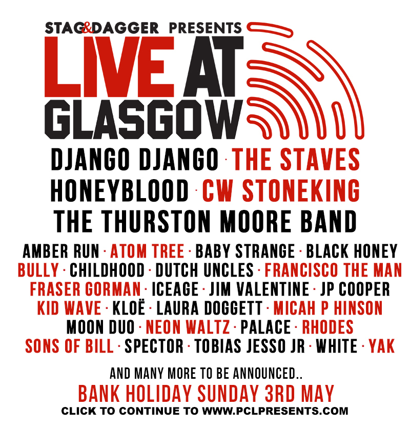 The Glasgow one-day event, rebranded from Stag & Dagger, now sees folk-rock trio The Staves, psych-six-piece Neon Waltz and Americana singer-songwriter Micah P Hinson, along with other acts such as Francisco The Man, Kid Wave, Yak, Bully, CW Stoneking, Son’s of Bill, Atom Tree and Fraser Gorman joining the previously announced initial lineup, which featured Django Django, Honeyblood, Moon Duo, Iceage, Tobias Jesso Jr and Laura Doggett.