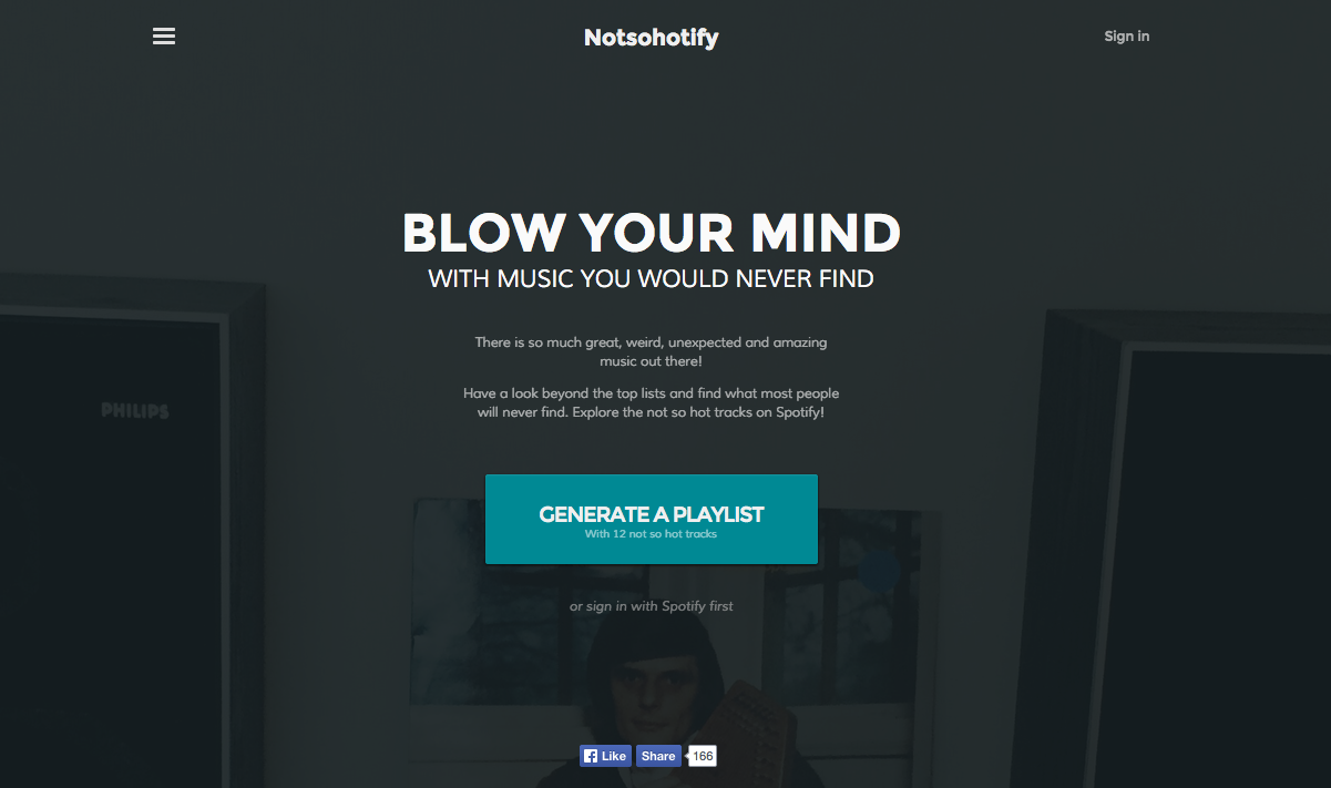 Titled Notsohotify, the app works through Spotify to generate playlists based on low popularity ratings. Now, although it sounds like it generates playlists that are a bit crappy, it actually draws from pools of noise that are totally untapped - it's not about bad music, it's just about unknown music. Some is pap, for sure, but there are gems nestled in there from bands you'd never know existed otherwise. Just be prepared to suffer the odd polka ditty. You can check it out here.