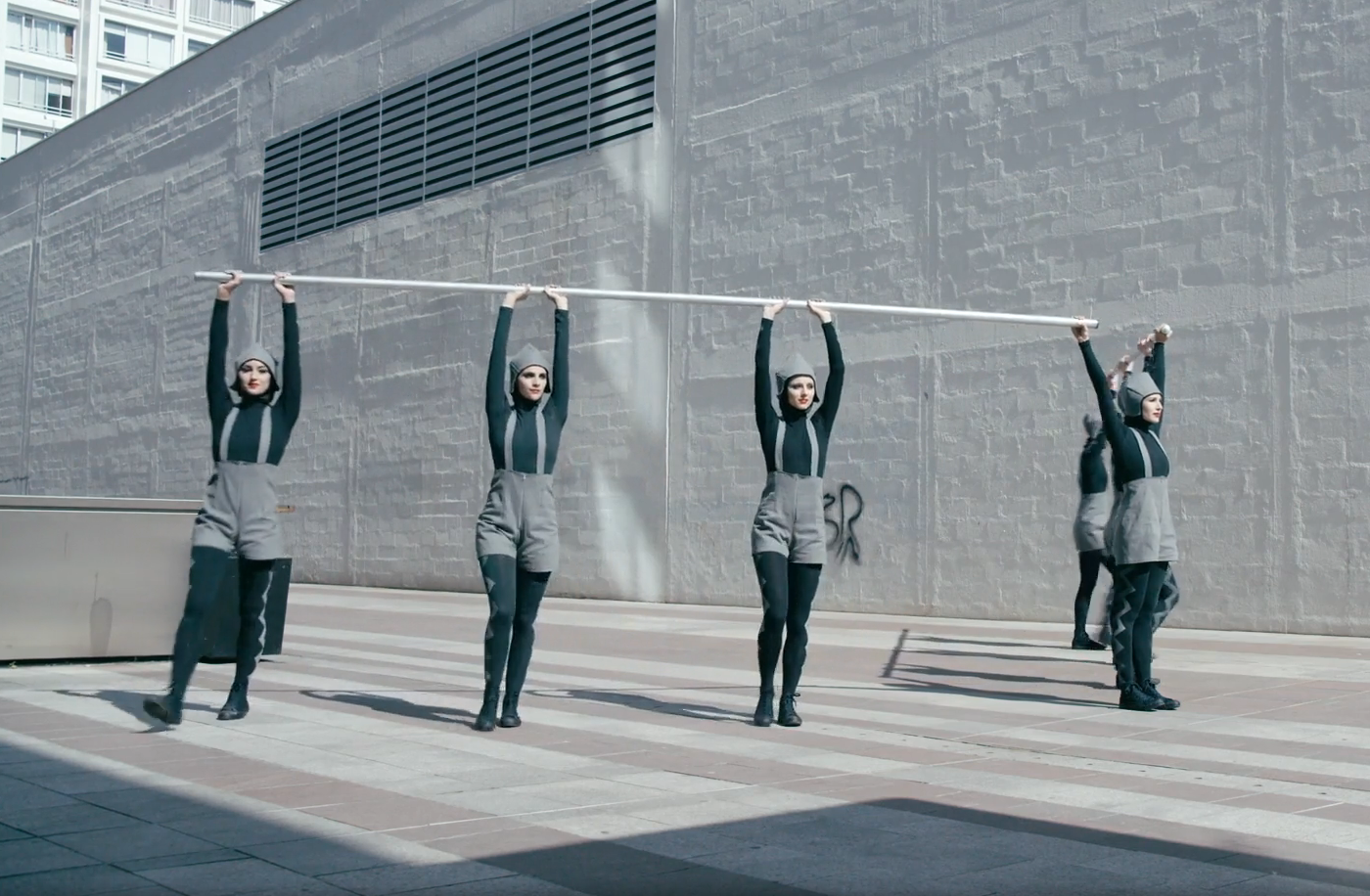 It's delivered in the form of a futuristic music video; Michel Gondry has directed the abstract clip, which features a range of dancers wearing sci-fi lederhosen twirling scaffolding poles.