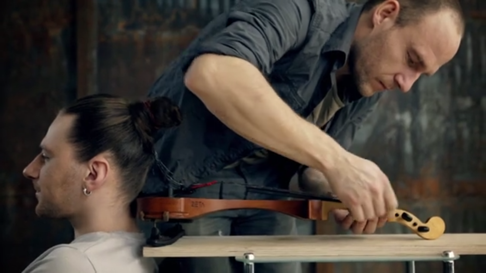 In the video below, you’ll see an edited-down take on the process (which actually took a few hours altogether), where Belickas glues Maksimovas’ locks and runs them through the instrument, tunes it up and gives a quick demonstration of the human-hair violin as its still attached to Maskimovas’ head before cutting the instrument free from the artist’s dome.