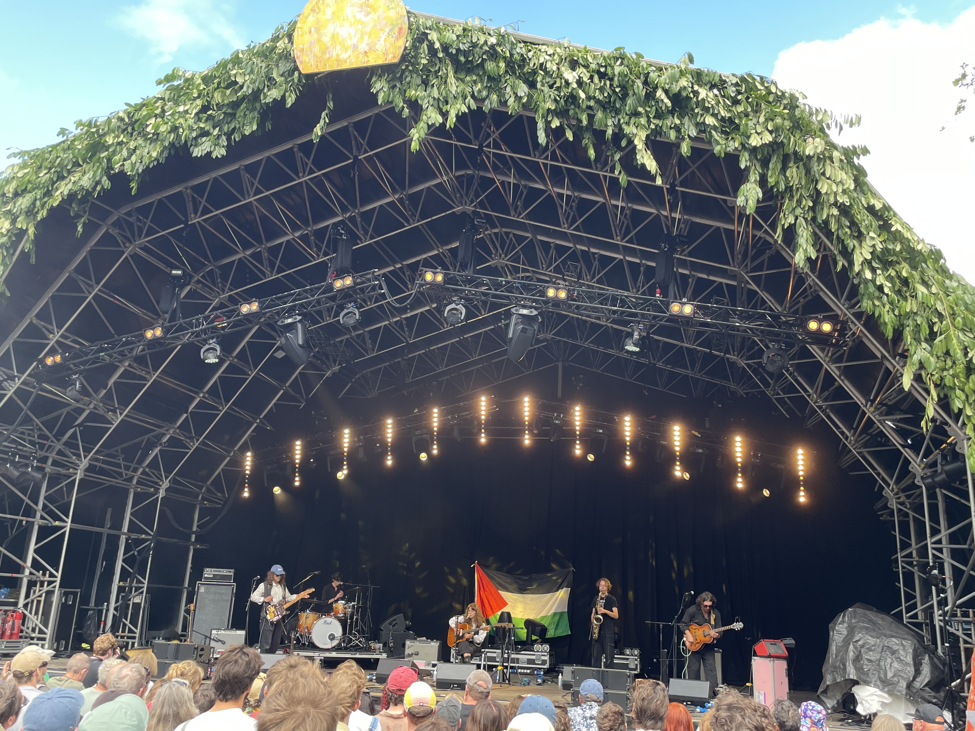 Rickman brought her enveloping avant-garde folk to End of the Road’s Garden Stage during intermittent downpours. She also brought urgent messaging, the likes of which has seen hundreds of peaceful protestors arrested over the last tumultuous few months. It wasn’t just her Palestine flag backdrop; Rickman’s banjo/guitar player Isaac Ockenden addressed the crowd part way through the show: “Wanna take a quick second to announce our solidarity with the people of Palestine, the people of Gaza. Boycott! Do anything you can!” he says, and, after a beat, “royally fuck the IDF.”