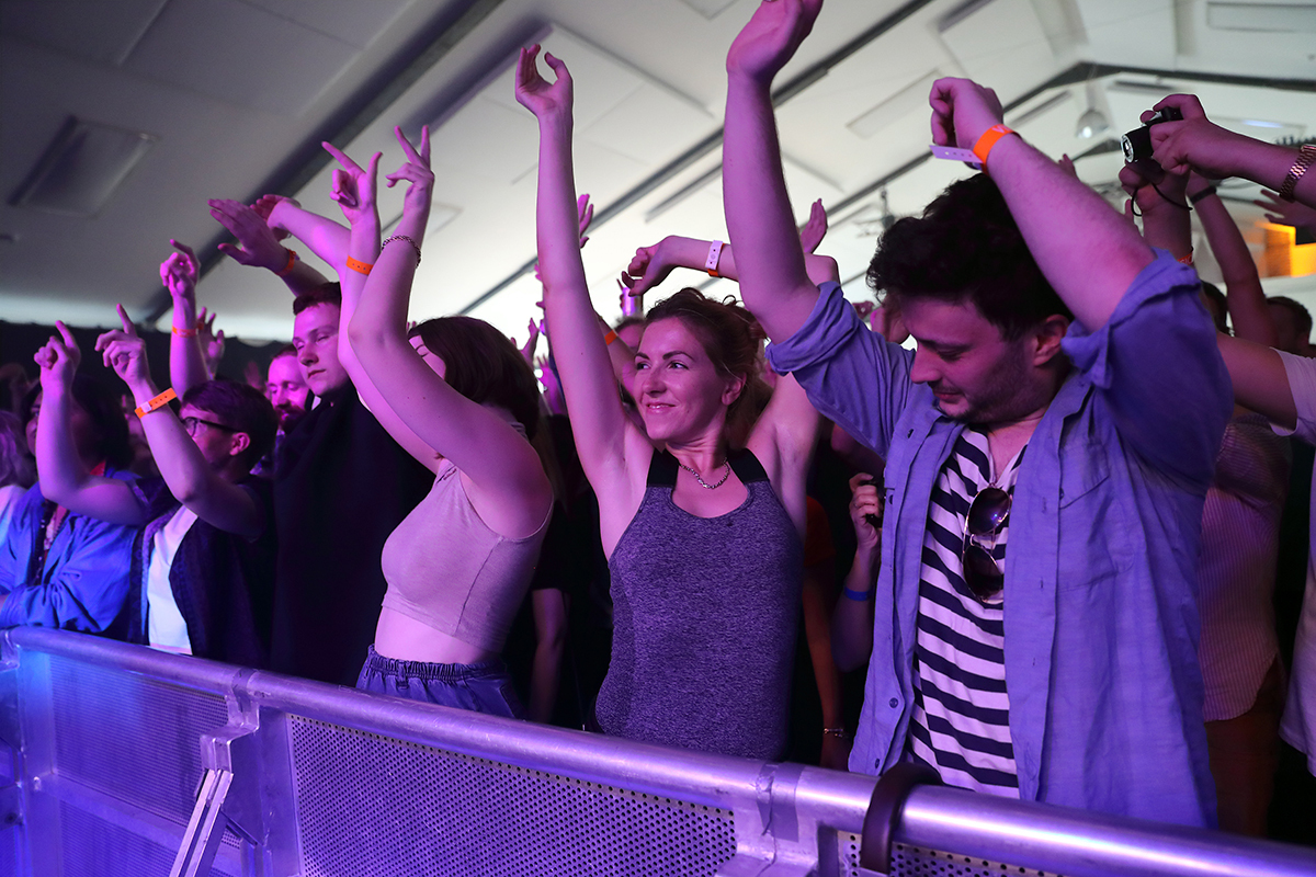 In fact, the atmosphere at Visons Festival was almost always pleasant. At one point, a security guard remarked to me that he had had no troubles all day, and it was easy to see why. At no juncture did anyone seem to get pissed off in any way. Taking place over five different venues in London’s Hackney, with the sun shining throughout as people made the pilgrimage from venue to venue, it was a truly feel-good festival. A great illustration of this atmosphere was during ESG’s carnival-esque set (if you ever get the chance to see ESG, grab it with both hands) in St John at Hackney, where a security guard went racing through the crowd, not in pursuit of someone, but dancing manically to the music.